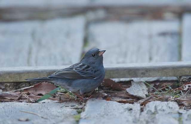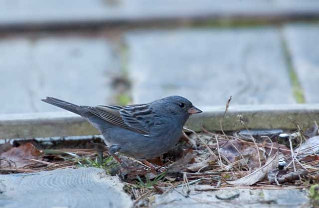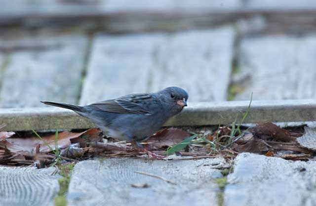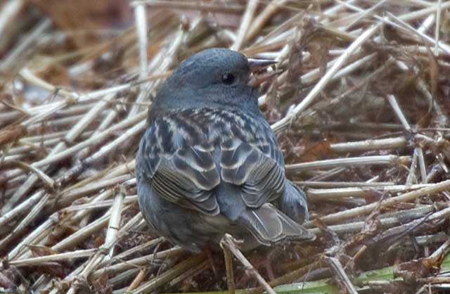 2005.1.24 クロジ♂ 地上に落ちた草木の実を探して食事中でした。 羽の黄褐色味が少なく間違いなく雄です。 |