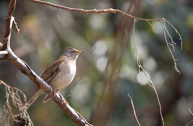 2005.2.4 シロハラ♀ どこに行っても出会うシロハラの♀ですが、光の加減なのか、白い眉に黒い過眼線のようにも見えて、マミチャジナイ風のシロハラです。 車のところまで帰ってきてカメラをしまおうとしたときに林の縁で見送ってくれました。 |