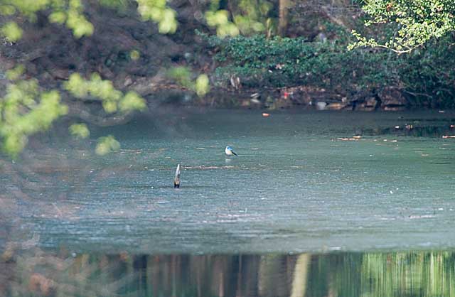 2005.2.4 ルリビタキ♂ 対岸からの撮影ですが、山中の池の岸近くが凍っています。 ルリビタキが氷の上に止まったり、飛んだりしてまるで遊んでいるように見えました。 |