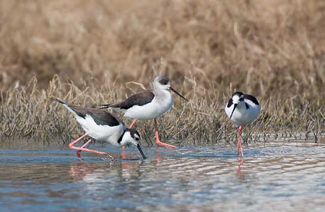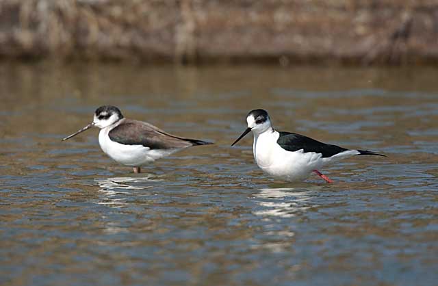 2005.2.21 クロエリセイタカシギ この写真は上の3羽とは別行動している2羽のグループです。 2時間ほど、3羽のグループを撮影している時に、最後に隣の池に現れたカップルです。 以後に登場する写真はすべて上記の3羽のグループのメンバーの写真です。 |