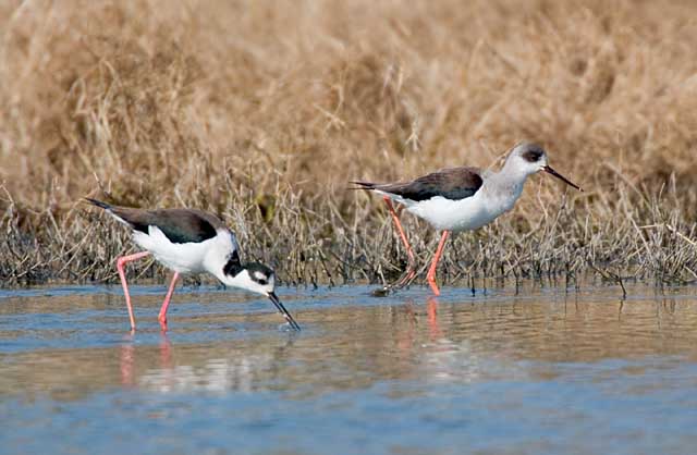 2005.2.21 クロエリセイタカシギ 右の個体は首の後ろやエリの部分が黒くなく、亜種セイタカシギか、亜種クロエリセイタカシギかわかりませんが、若鳥と思われます。 いずれにしてもこのような若鳥が一緒にいるということは、放鳥されたクロエリセイタカシギがセイタカシギの渡りのルートの中にあって繁殖に加わっている可能性が高いと考えられます。 不用意な放鳥が生態系に混乱をもたらすことが憂慮されます。 |