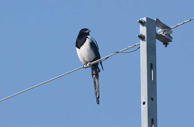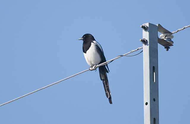 2005.2.28 カササギ 佐賀市から鹿島市に向かう国道207号線を走っているときに電柱の上に止まっているのを見つけましたが、光線が良くてきれいに見え、ちょうど都合良く、コンビニの前で、駐車場がありましたので車を止めて撮影しました。 |