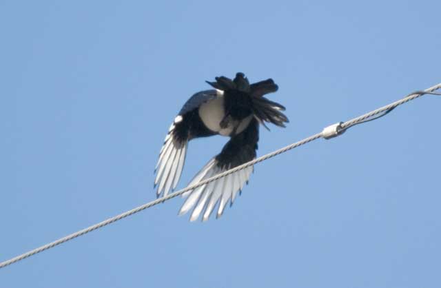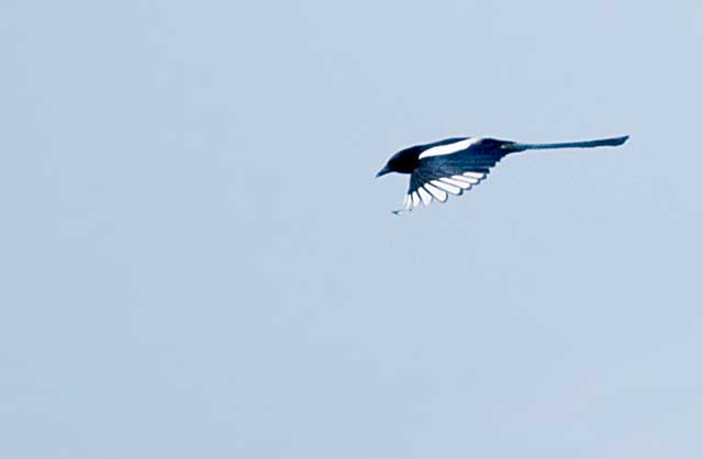 2005.2.28 カササギ これは別の写真ですが、飛ぶときはカケスのようにふわふわとした飛び方で、青色光沢のある黒い羽と白のコントラストがきれいです。 |