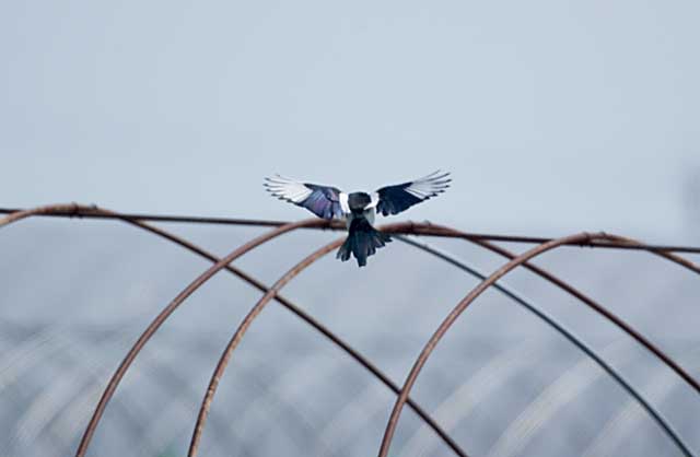 農業用ビニールハウスの鉄骨に止まろうとしているところです。