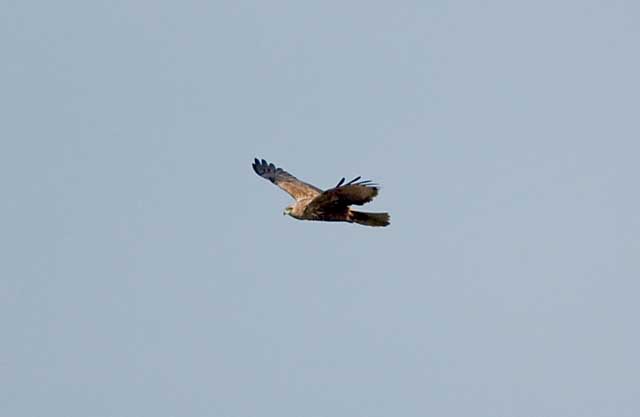2005.3.7 チュウヒ 能登川町の河口の葦原でカモを撮影していた時にやってきたチュウヒです。 チュウヒはタカの仲間で体長は雄で48cm、雌で58cm程度です。 この鳥はカラスよりあきらかに大きくトビ位の大きさに見えましたので雌ではないかと思います。 |