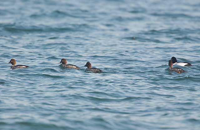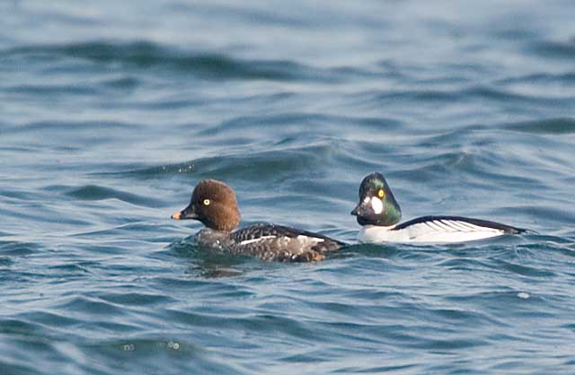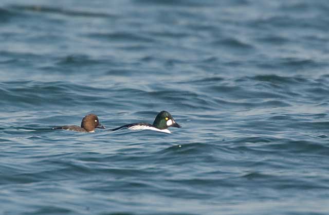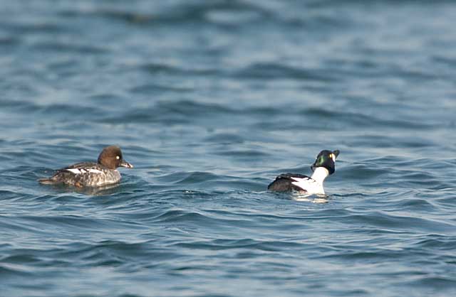 2005.3.7 ホオジロガモ雌雄 遙か沖合ですので波間に見え隠れしています。 |