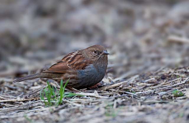 灌木の下にいて、褐色の背中にグレーの胸ということで一回り小さいですがクロジに感じが似ています。