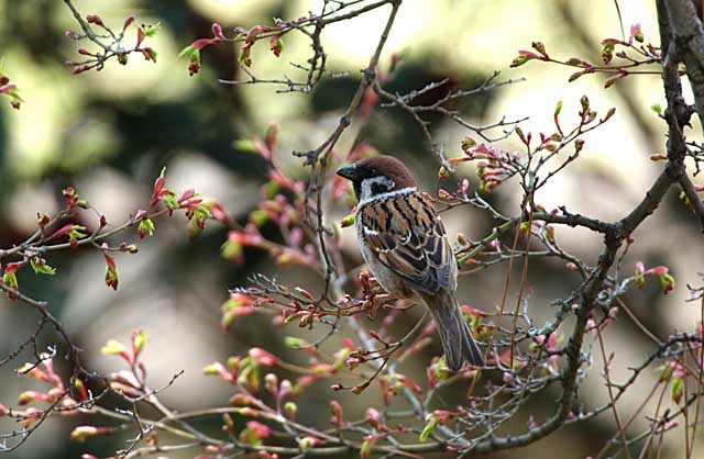 おなじみの普通のスズメですが、こちらは、少し開いて来た、モミジの芽を食べていました。
