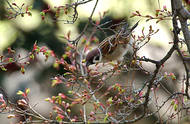 おなじみの普通のスズメですが、こちらは、少し開いて来た、モミジの芽を食べていました。