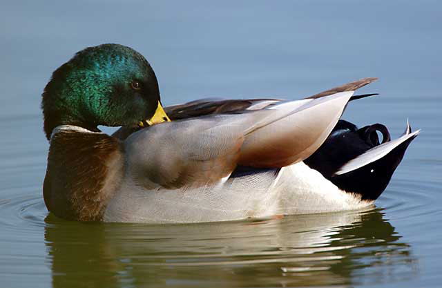 芦の隙間から、カモたちの午後の水浴の風景を撮影していたら、雄のマガモがすぐ目の前にゆっくりと流れて来ました。