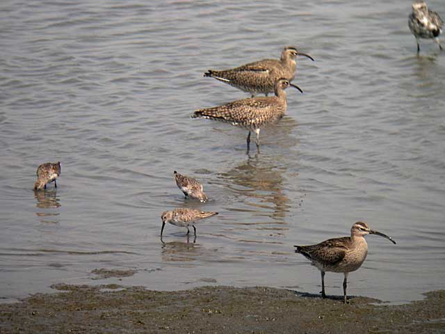 大きな3羽がチュウシャクシギ、小さな3羽はハマシギです。