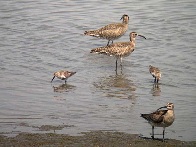 大きな3羽がチュウシャクシギ、小さな2羽はハマシギです。